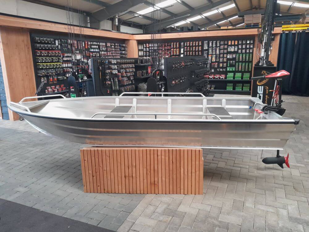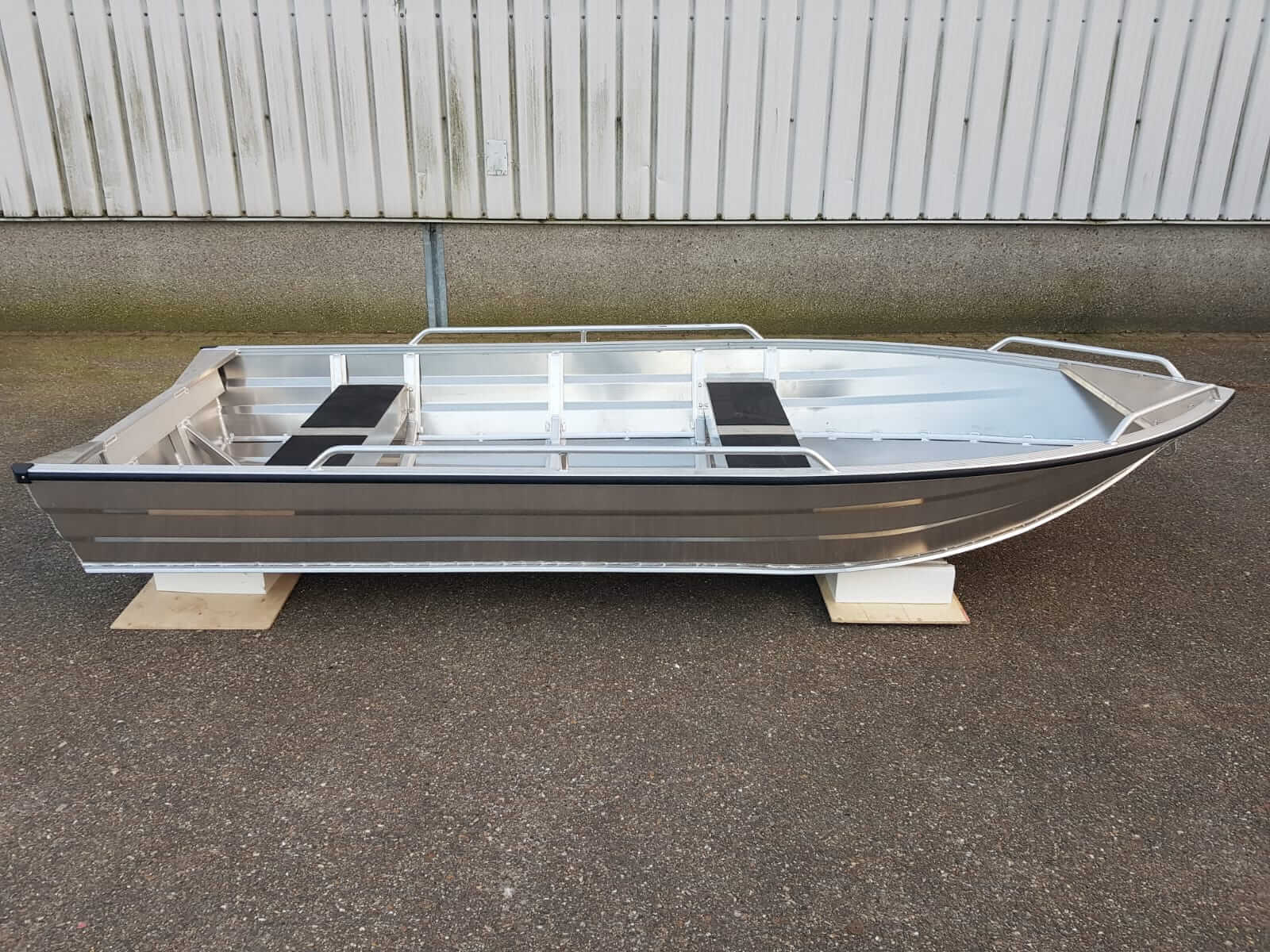 Robuuste aluminium V-visboot met twee stevige bankjes, ideaal voor sportvissers of recreatief gebruik.